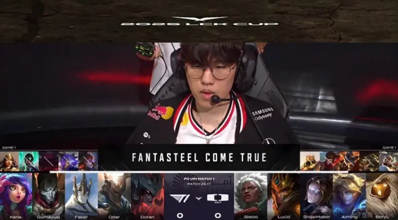 T1选用:Doran剑魔、Oner潘森、Faker加里奥、Gumayusi烬、Keria妮蔻